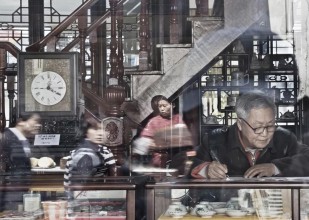 老铺子古董店里写字的老板与玻璃橱窗里折射出的摊贩与行人,构成了一幅老宅与老街的风景画。(2008年3月摄于山塘街)