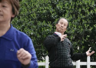 老阿姨全身心投入广场舞,后面的老人也在认真学着跳。(2012年4月摄于大公园)