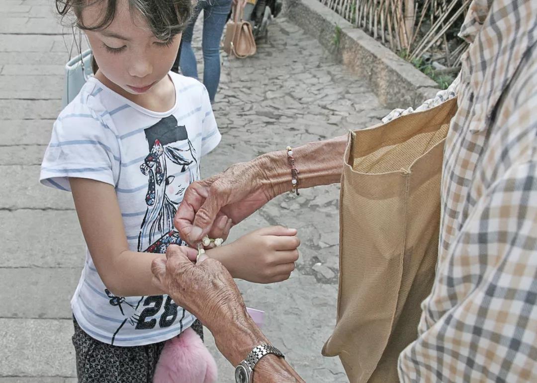 卖花阿婆为买花的小女孩儿带上腕花环。(2016年8月摄于平江路)
