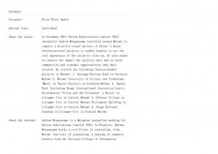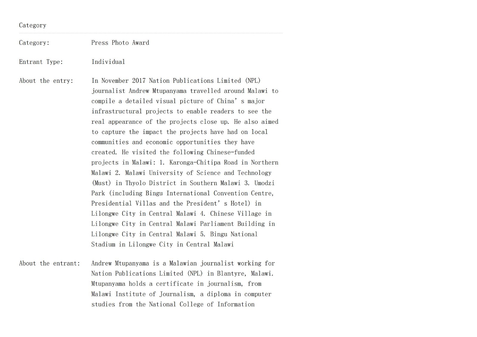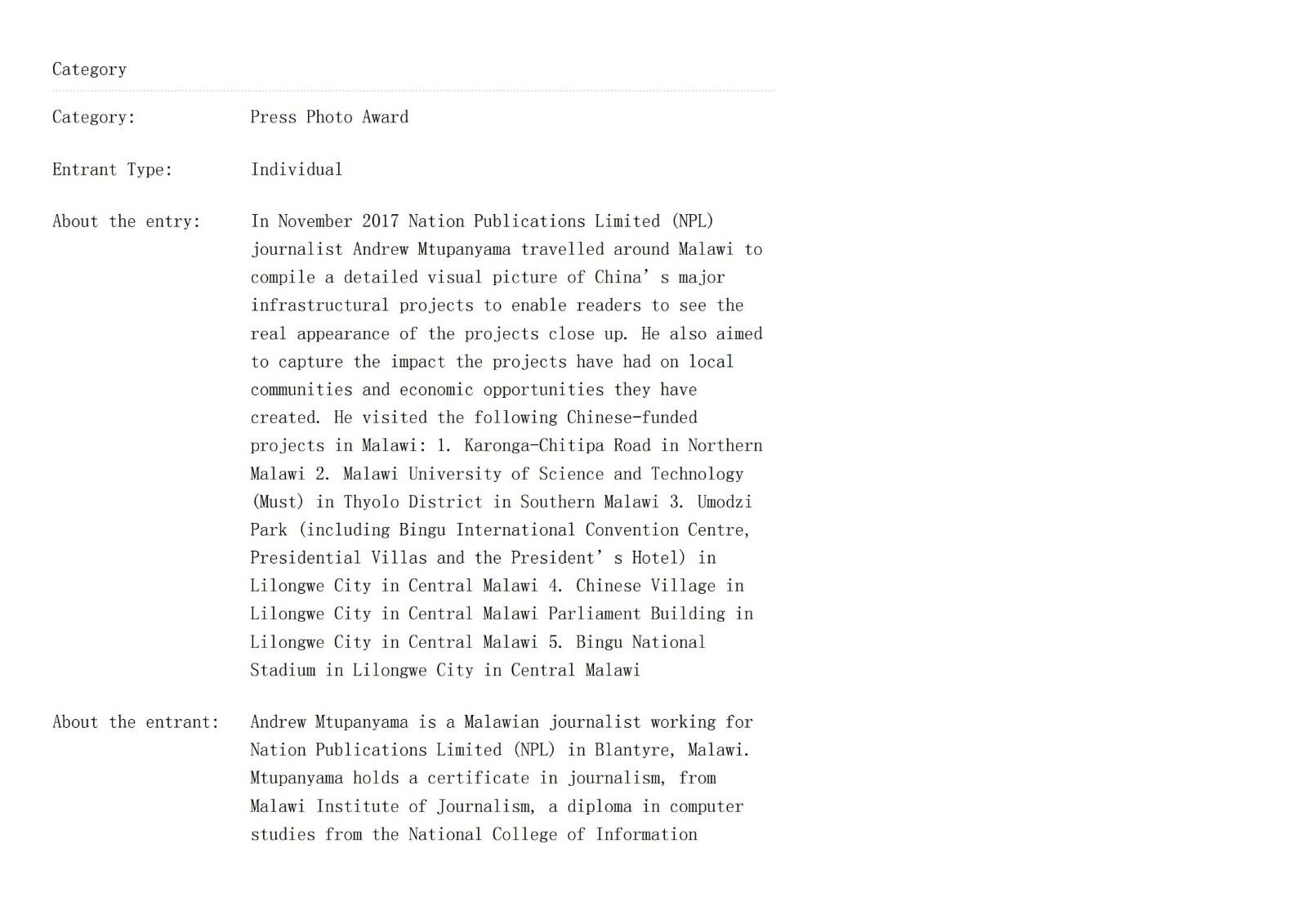 2017年11月,国家出版有限公司(NPL)记者Andrew Mtupanyama走遍马拉维,汇编了中国重大基础设施项目的详细视觉图片,让读者近距离看到项目的真实面貌,并了解这些项目对当地社区的影响以及它们创造的经济机会。在马拉维参观了以下中资项目: