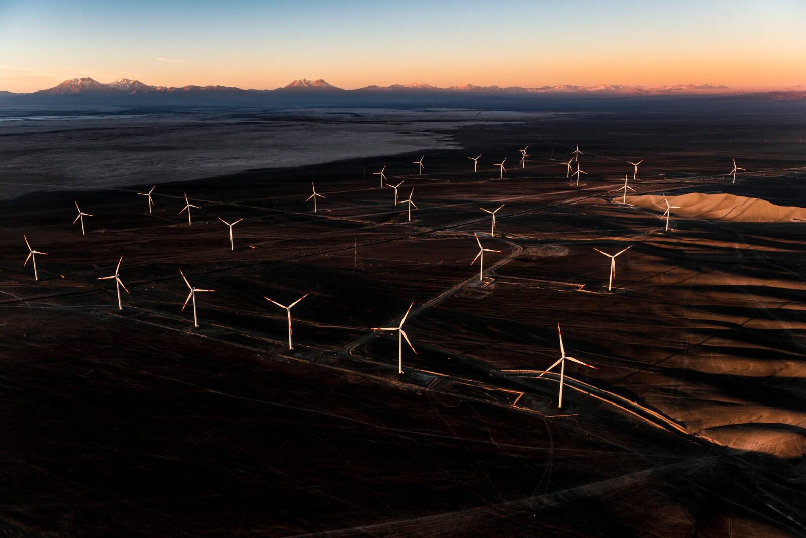 6.智利卡拉马附近的Eólico Valle de los Vientos公园,一个由45台风力发电机组成的90兆瓦的风力发电场,向国家电力系统(SEN)提供电力。