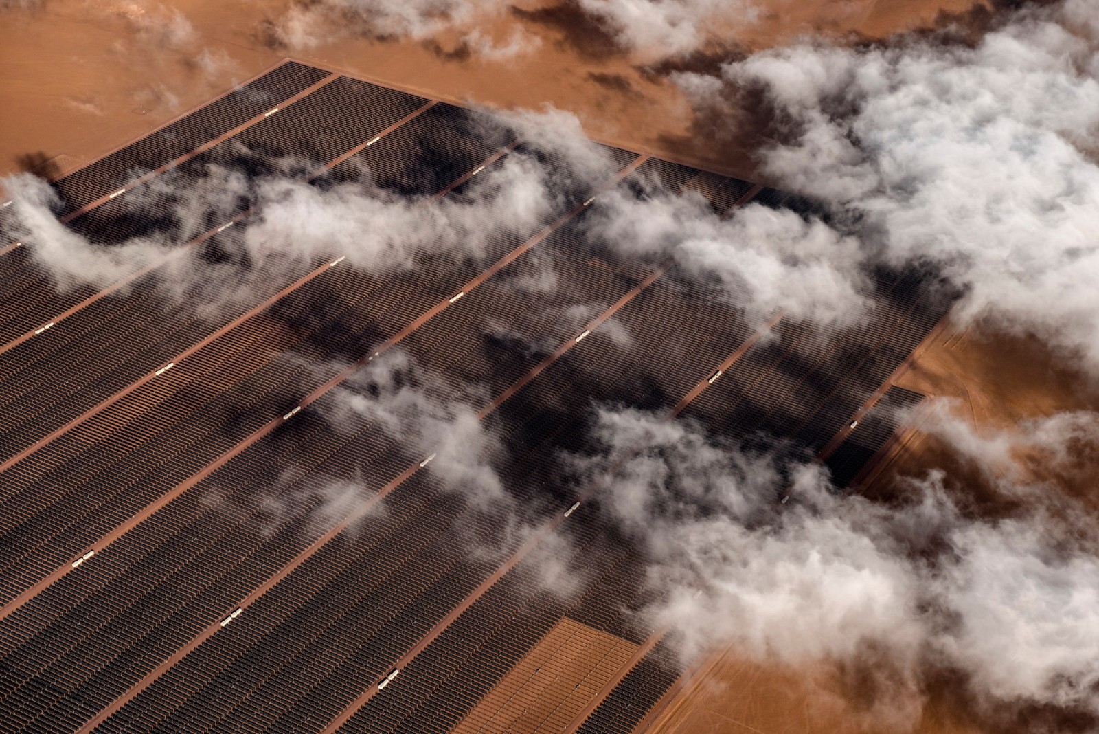 Parque Solar Carrera Pinto (foreground) and Parque Solar Fotovoltaico Luz de Norte (background), northeast of Copiapó, Chile. 97-megawatt Carrera Pinto and 141-megawatt Luz de Norte supply power to Chilean population centers via the Sistema Eléctrico Nacional (SEN).