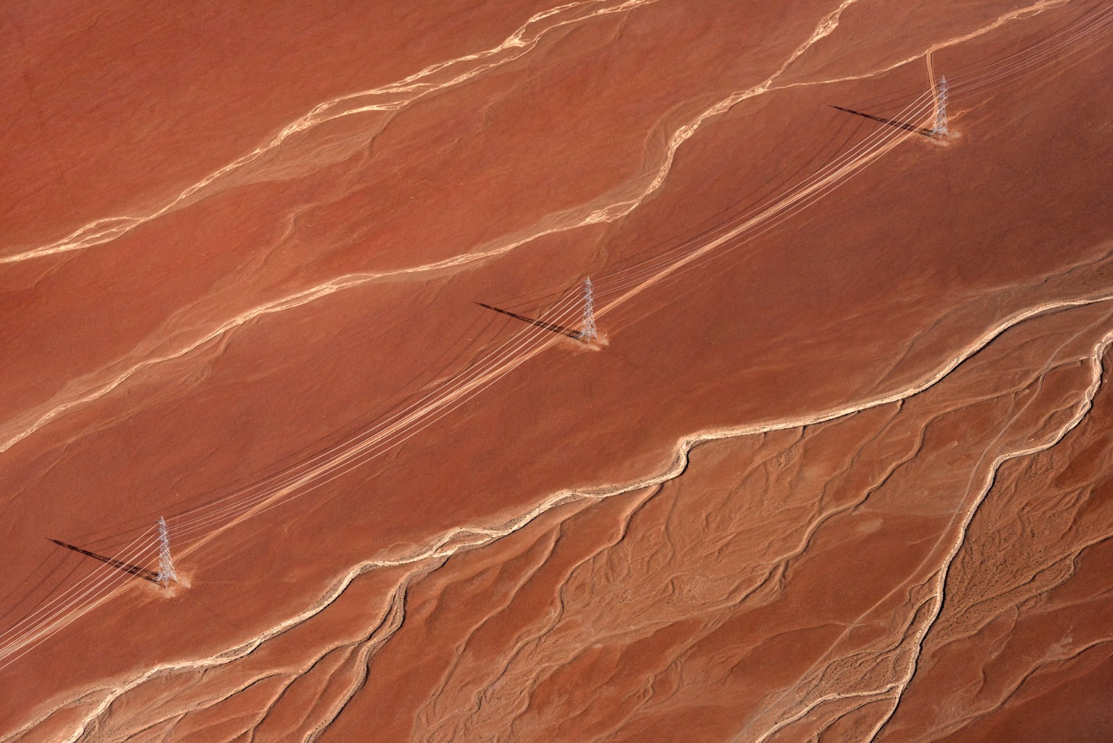 Transmission towers, Atacama Region, Chile. New transmission lines move renewable energy to population centers in southern Chile via the Sistema Eléctrico Nacional (SEN).