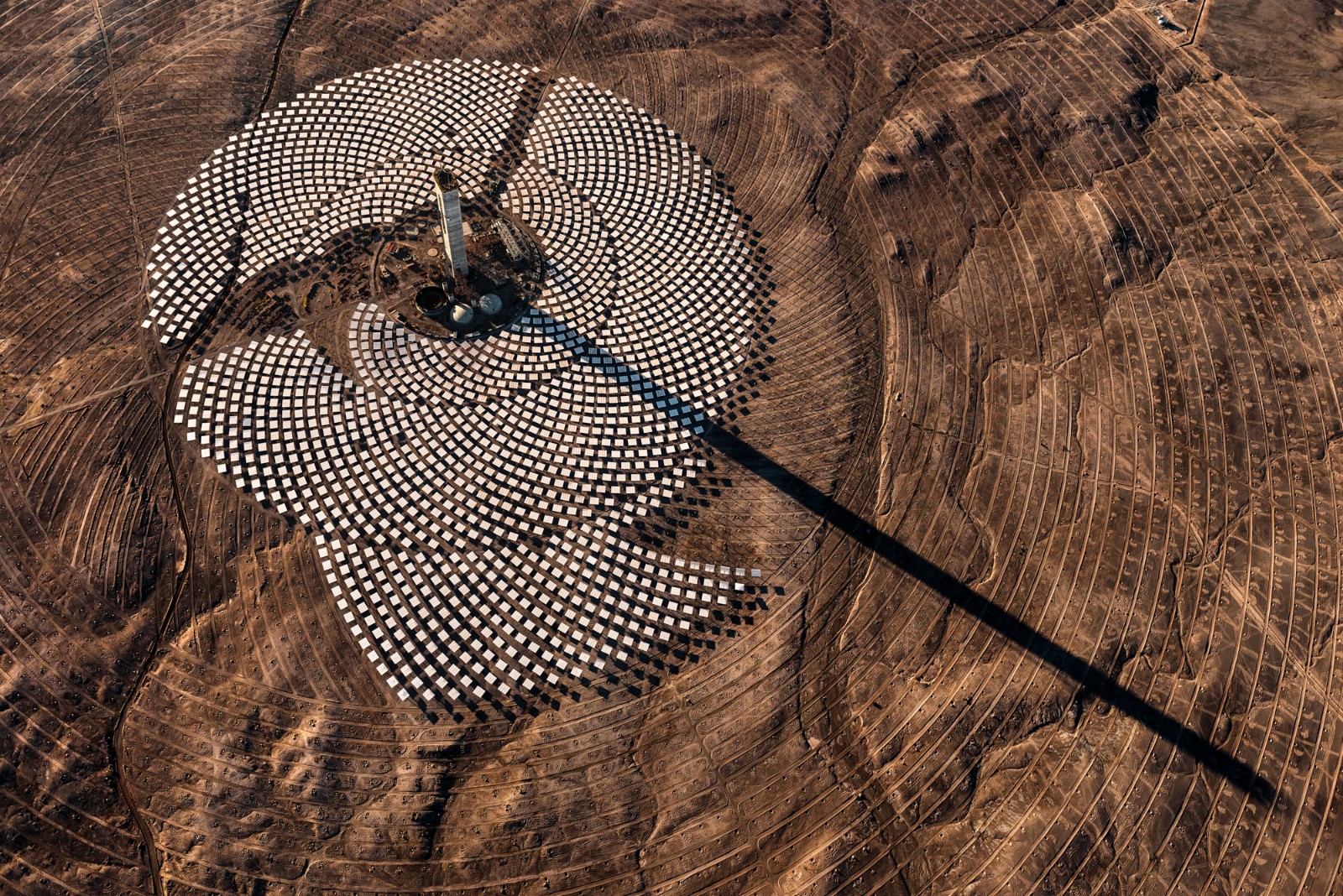 Cerro Dominador, 25 kilometers west-northwest of Sierra Gorda, Chile. Constructed around a 252-meter-high receiver, this 110-megawatt concentrated solar plant includes 17.5 hours of molten salt storage capacity, and is part of a hybrid facility that incorporates a 100-megawatt photovoltaic plant.