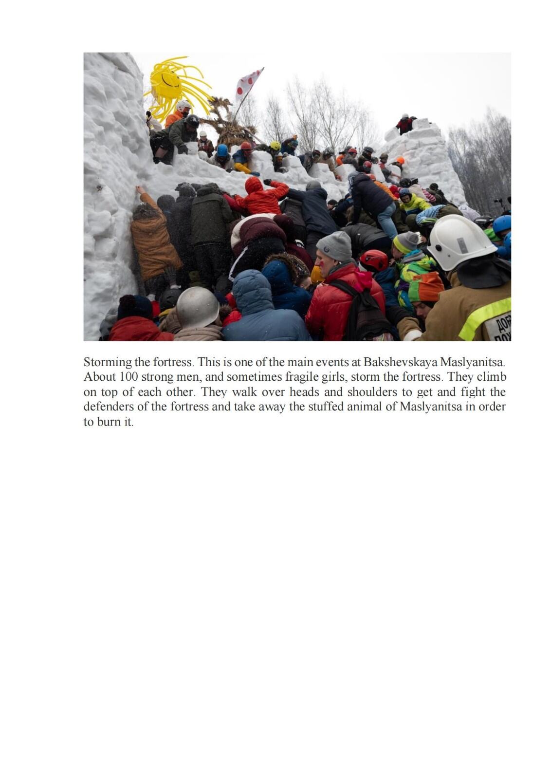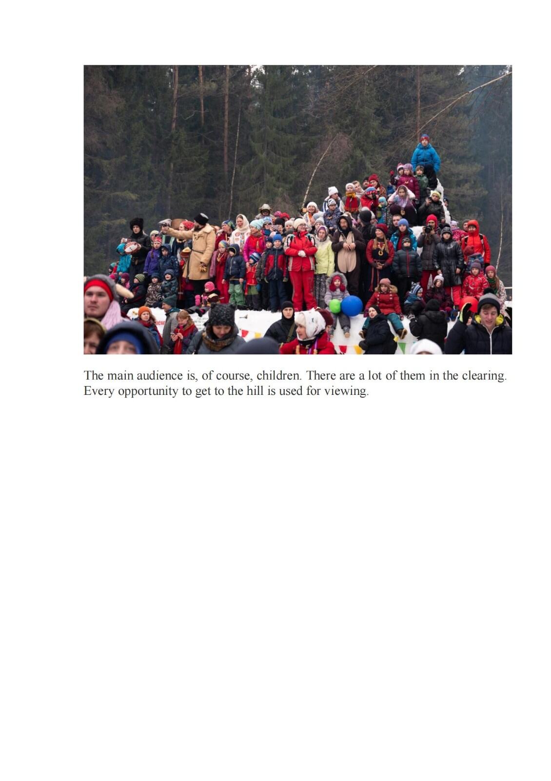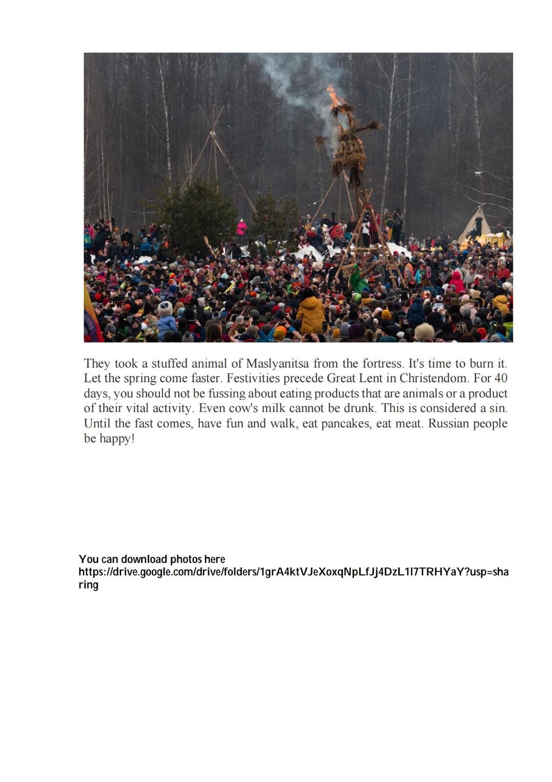 本组作品反映俄罗斯民间传统和莫斯科地区传统节日Bakshevskaya Maslyanitsa。Bakshevskaya Maslyanitsa 由一群学生在1986年创立,每年举办地都不相同。这些地方通常不通汽车,人们需要骑马在森林和田野里穿行一个多小时,走大约6-7公里才能到。有些人会趁着假期,在森林里住几天。节日期间,人们围着篝火,弹吉他唱歌。他们在森林里、草地上,庆祝、游戏、比赛、欢乐。最主要的活动——送走冬天,人们会点火,烤煎饼。之后,阳光明媚,春天应约而来。不过,有些任务还是很艰巨的,比如,人们要从冰雪城堡里抢稻草人,这需要良好的身体素质;身强力壮的人们从外面冲击雪堡,努力将稻草人偷出,然后烧掉;此后,善良的人们载歌载舞,歌唱爱情和春天。这个节日每年吸引六千多人参加,人们在节日里吃煎饼,忏悔节也吃煎饼,地道的俄罗斯传统。