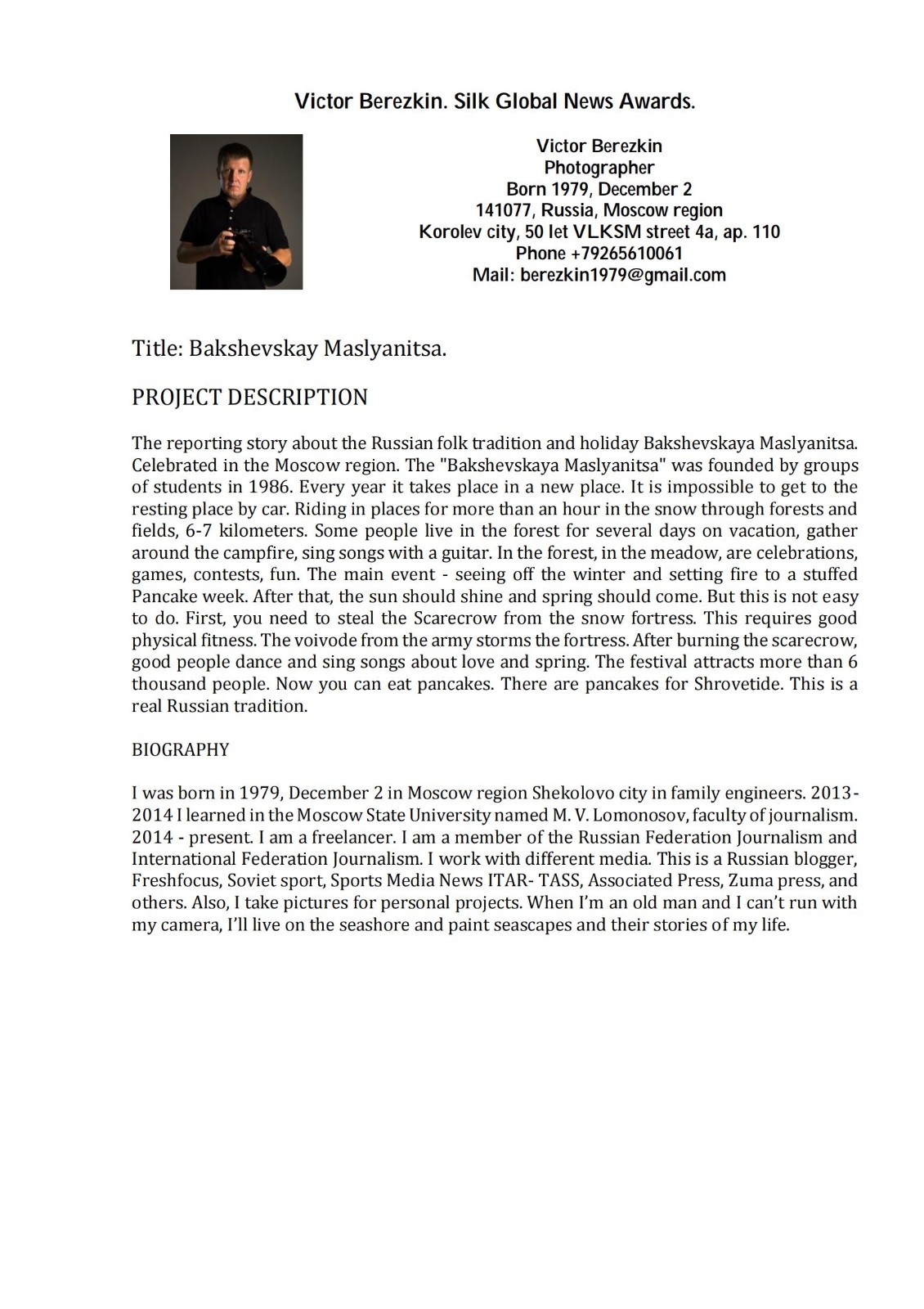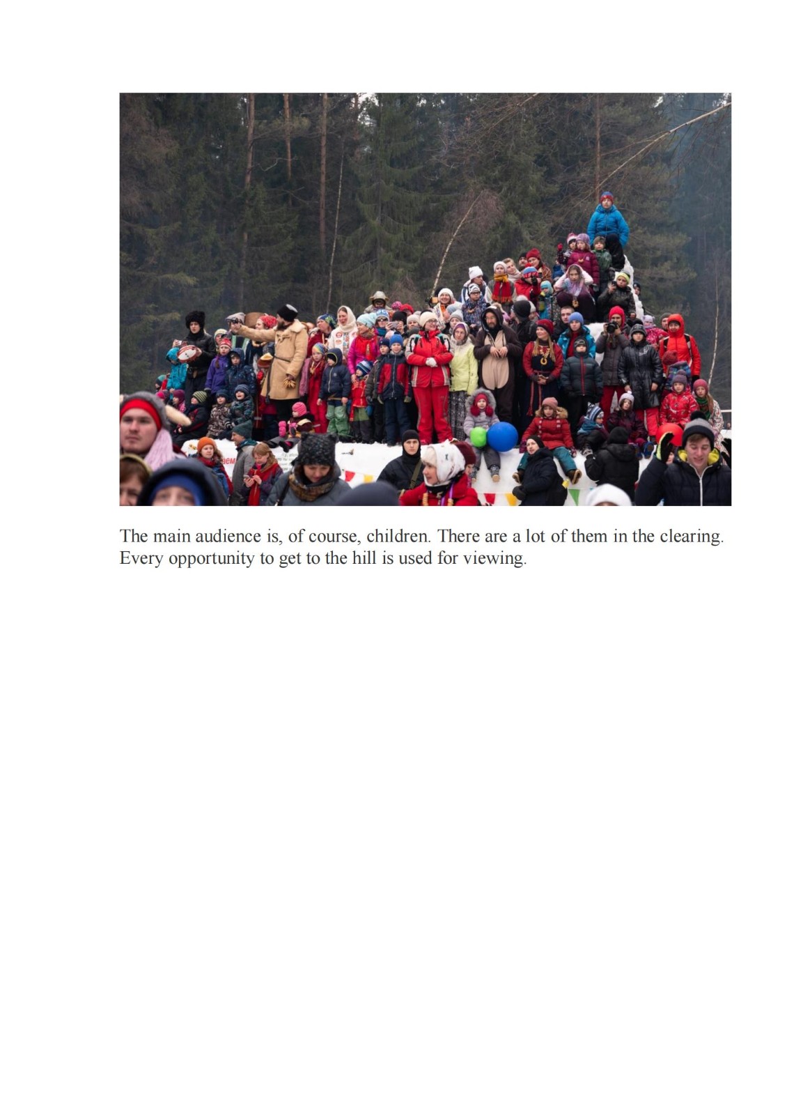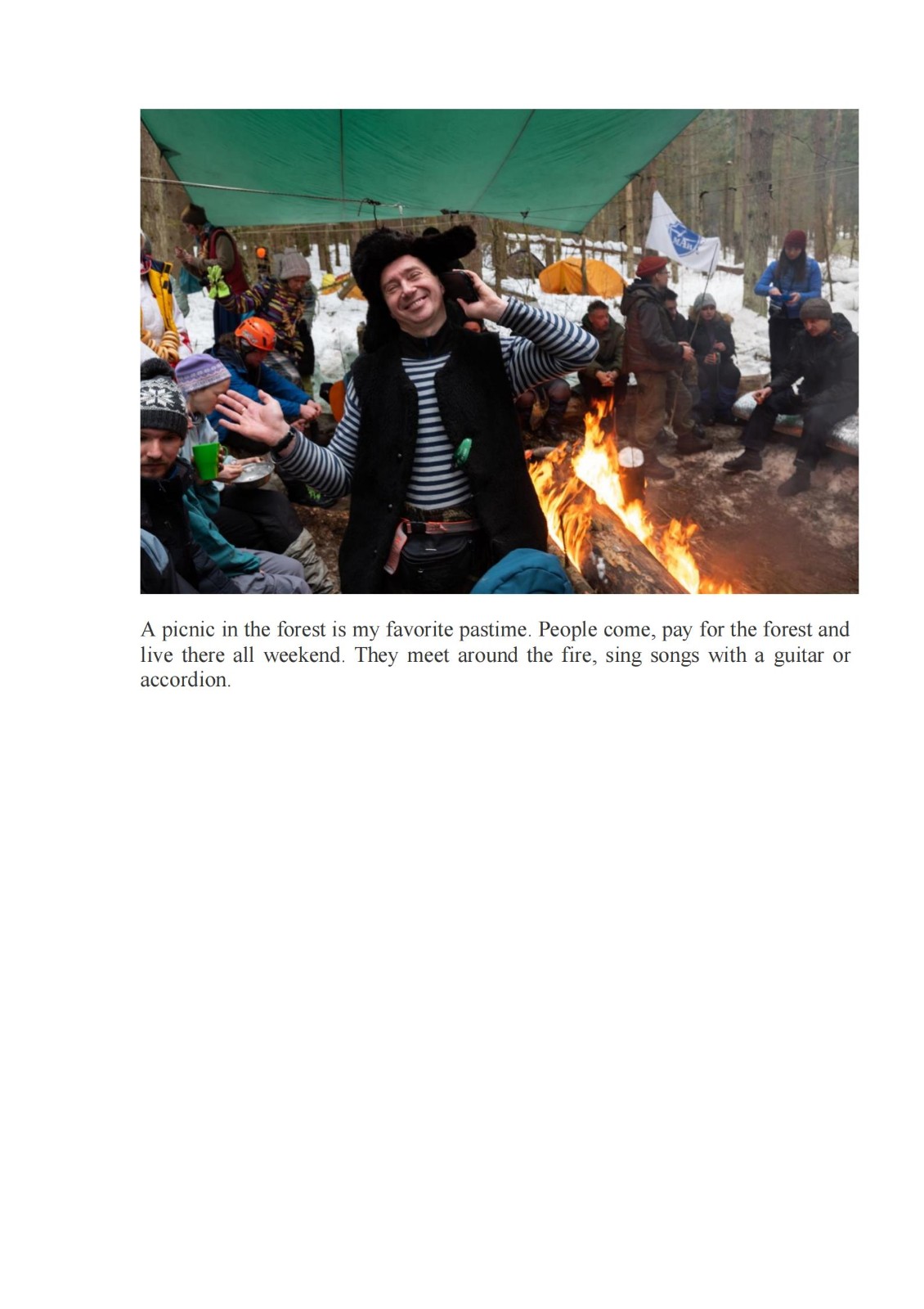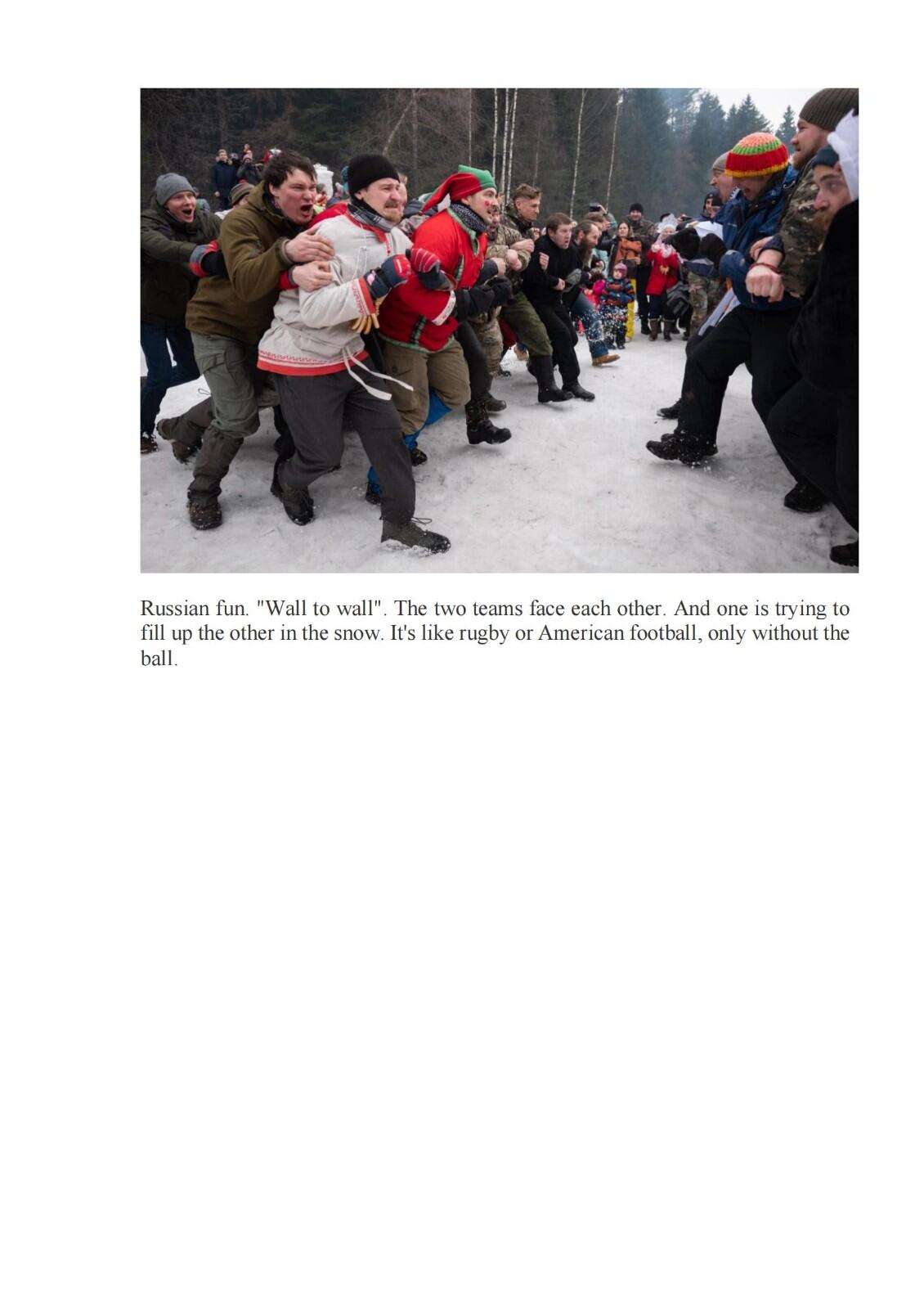本组作品反映俄罗斯民间传统和莫斯科地区传统节日Bakshevskaya Maslyanitsa。Bakshevskaya Maslyanitsa 由一群学生在1986年创立,每年举办地都不相同。这些地方通常不通汽车,人们需要骑马在森林和田野里穿行一个多小时,走大约6-7公里才能到。有些人会趁着假期,在森林里住几天。节日期间,人们围着篝火,弹吉他唱歌。他们在森林里、草地上,庆祝、游戏、比赛、欢乐。最主要的活动——送走冬天,人们会点火,烤煎饼。之后,阳光明媚,春天应约而来。不过,有些任务还是很艰巨的,比如,人们要从冰雪城堡里抢稻草人,这需要良好的身体素质;身强力壮的人们从外面冲击雪堡,努力将稻草人偷出,然后烧掉;此后,善良的人们载歌载舞,歌唱爱情和春天。这个节日每年吸引六千多人参加,人们在节日里吃煎饼,忏悔节也吃煎饼,地道的俄罗斯传统。