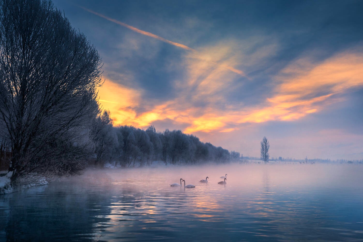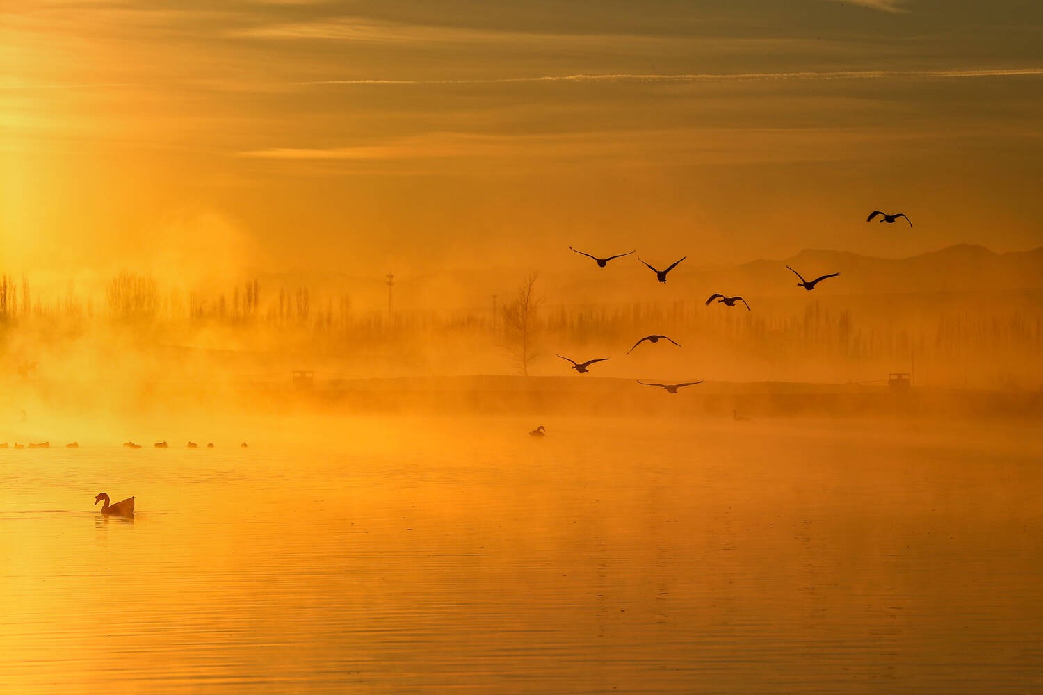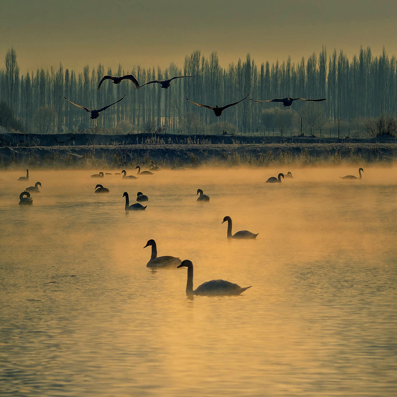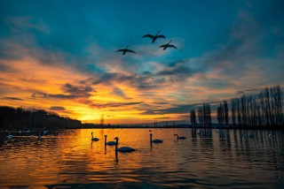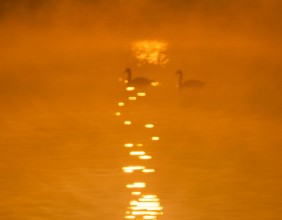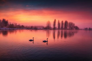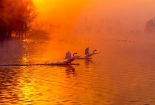 吴霖《天鹅嬉霞》
